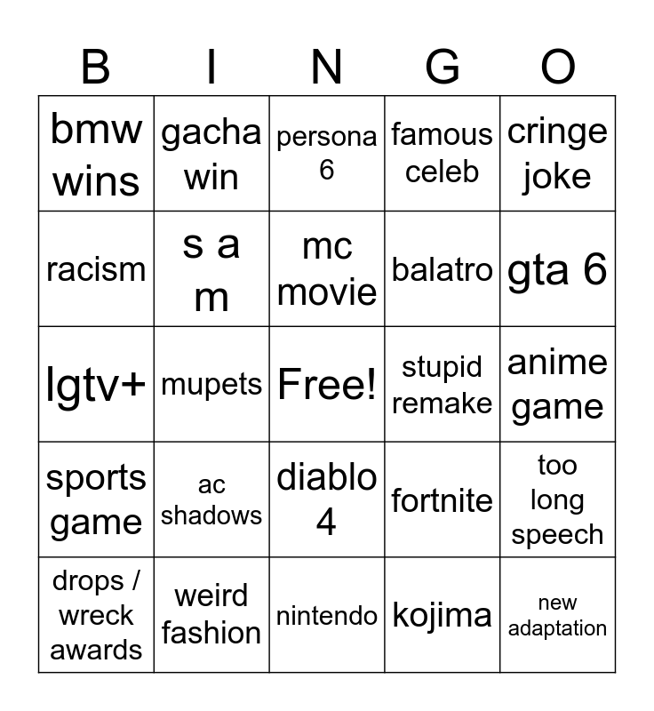 This bingo card has a free space and 24 words: ac shadows, weird fashion, mc movie, drops / wreck awards, cringe joke, bmw wins, racism, gacha win, stupid remake, diablo 4, balatro, lgtv+, fortnite, too long speech, s a m, kojima, anime game, persona 6, gta 6, mupets, new adaptation, sports game, famous celeb and nintendo.