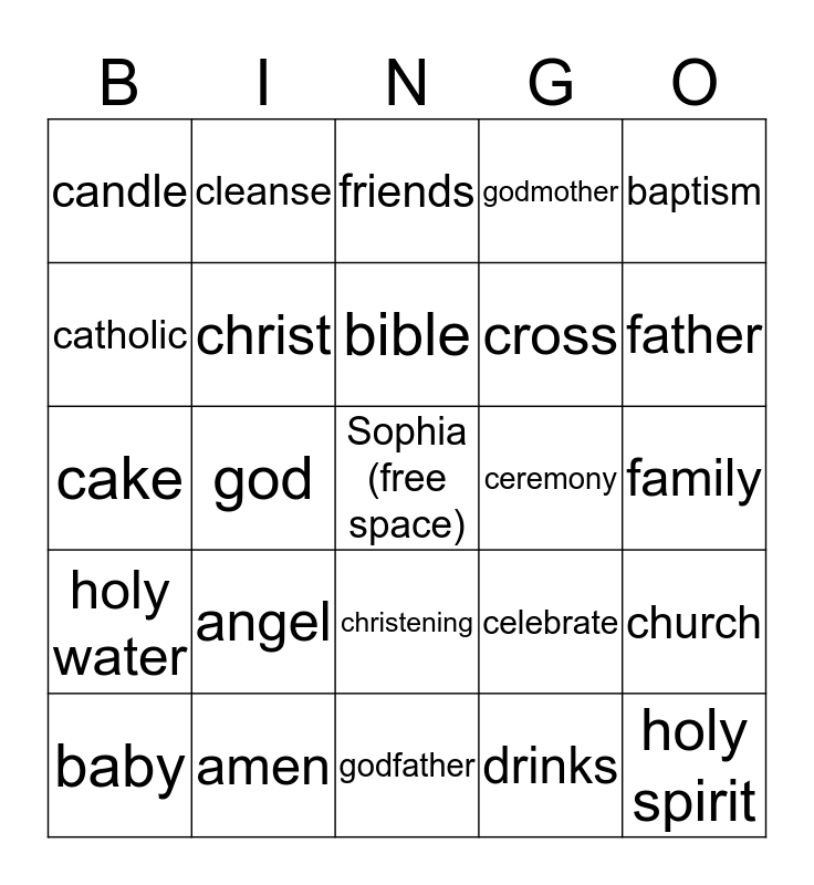 This bingo card has a free space and 24 words: angel, amen, bible, baby, baptism, candle, catholic, cleanse, ceremony, christening, cross, cake, celebrate, church, christ, drinks, family, friends, father, god, holy spirit, holy water, godmother and godfather.