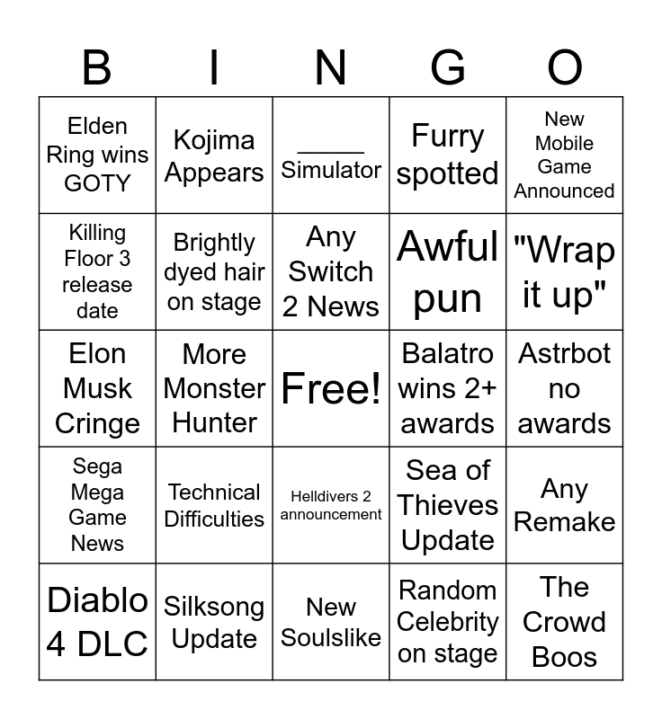 This bingo card has a free space and 24 words: Technical Difficulties, Silksong Update, Any Switch 2 News, Diablo 4 DLC, New Mobile Game Announced, Elden Ring wins GOTY, Killing Floor 3 release date, Kojima Appears, Balatro wins 2+ awards, Helldivers 2 announcement, Awful pun, Elon Musk Cringe, Sea of Thieves Update, Any Remake, Brightly dyed hair on stage, Random Celebrity on stage, Astrbot no awards, _____ Simulator, "Wrap it up", More Monster Hunter, The Crowd Boos, Sega Mega Game News, Furry spotted and New Soulslike.