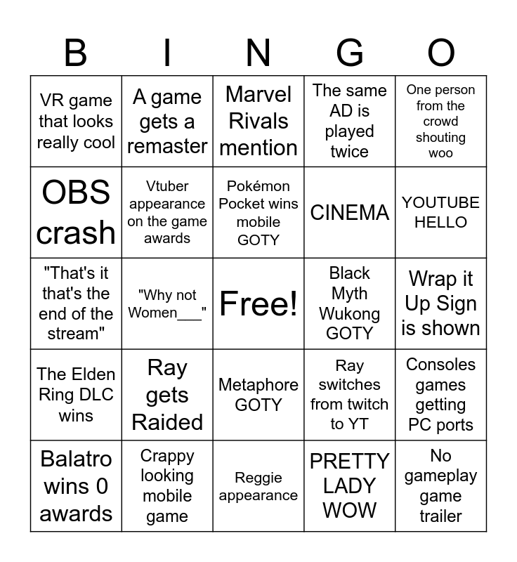 This bingo card has a free space and 24 words: Ray gets Raided, Crappy looking mobile game, Pokémon Pocket wins mobile GOTY, Balatro wins 0 awards, One person from the crowd shouting woo, VR game that looks really cool, OBS crash, A game gets a remaster, Black Myth Wukong GOTY, Metaphore GOTY, CINEMA, "That's it that's the end of the stream", Ray switches from twitch to YT, Consoles games getting PC ports, Vtuber appearance on the game awards, PRETTY LADY WOW, Wrap it Up Sign is shown, Marvel Rivals mention, YOUTUBE HELLO, "Why not Women___", No gameplay game trailer, The Elden Ring DLC wins, The same AD is played twice and Reggie appearance.
