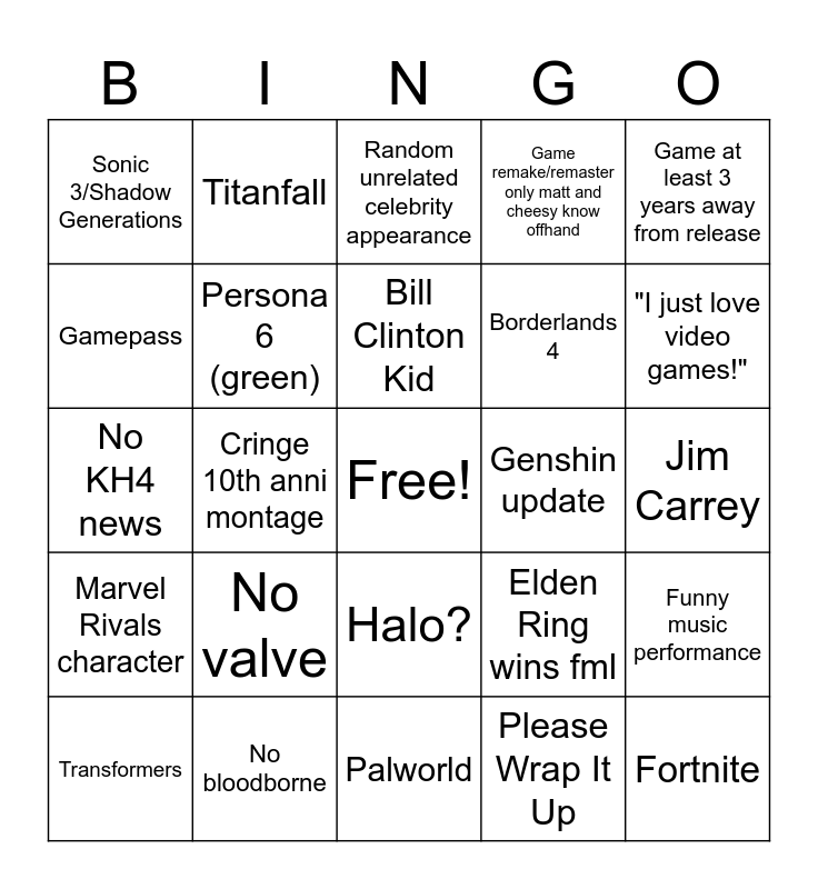 This bingo card has a free space and 24 words: No valve, No bloodborne, Bill Clinton Kid, Transformers, Game at least 3 years away from release, Sonic 3/Shadow Generations, Gamepass, Titanfall, Genshin update, Halo?, Borderlands 4, No KH4 news, Elden Ring wins fml, Funny music performance, Persona 6 (green), Please Wrap It Up, Jim Carrey, Random unrelated celebrity appearance, "I just love video games!", Cringe 10th anni montage, Fortnite, Marvel Rivals character, Game remake/remaster only matt and cheesy know offhand and Palworld.