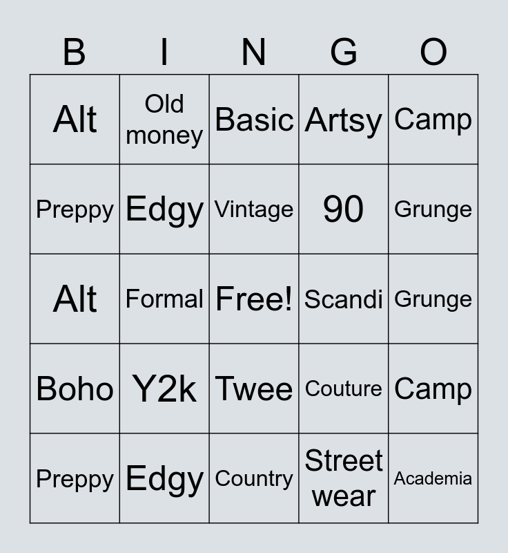 This bingo card has a free space and 49 words: Downtown girl, Y2k, Country, Street wear, Grunge, Boho, Old money, Athlesiure, 90, Academia, Preppy, Formal, Couture, Camp, Goth, Granola, Basic, Scandi, Sophisticated, Alt, Edgy, Twee, Artsy, Vintage, Downtown girl, Y2k, Country, Street wear, Grunge, Boho, Old money, Athlesiure, 90s, Academia, Preppy, Formal, Basic, Couture, Camp, Goth, Granola, Twee, Scandi, Sophisticated, Alt, Edgy, Vintage, Artsy and Costal granddaughter.