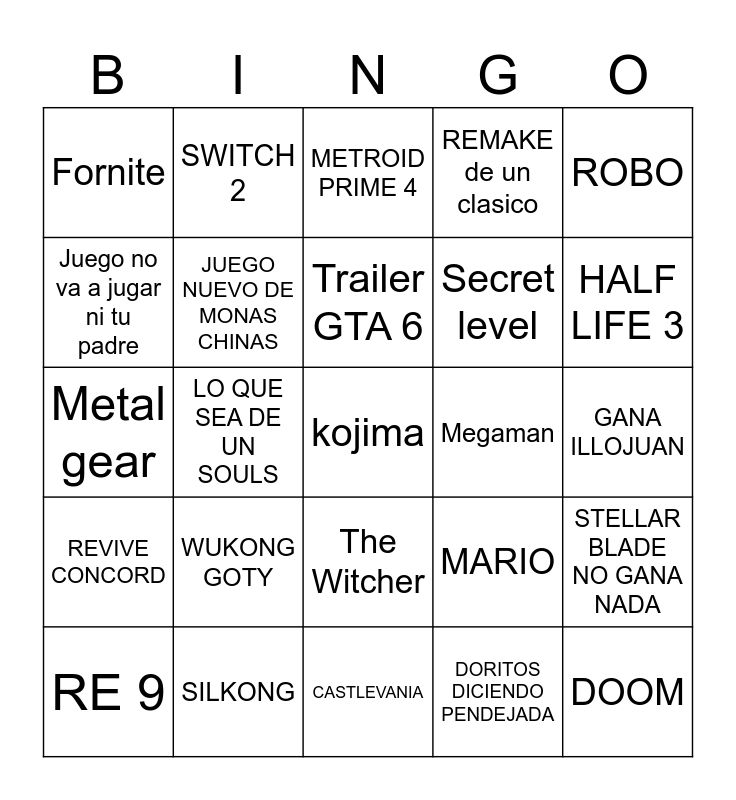 This bingo card has a free space and 24 words: WUKONG GOTY, SILKONG, Trailer GTA 6, RE 9, ROBO, Fornite, Juego no va a jugar ni tu padre, SWITCH 2, Megaman, The Witcher, Secret level, Metal gear, MARIO, STELLAR BLADE NO GANA NADA, JUEGO NUEVO DE MONAS CHINAS, DORITOS DICIENDO PENDEJADA, GANA ILLOJUAN, METROID PRIME 4, HALF LIFE 3, LO QUE SEA DE UN SOULS, DOOM, REVIVE CONCORD, REMAKE de un clasico and CASTLEVANIA.