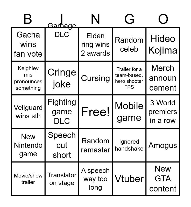 This bingo card has a free space and 39 words: Xbox handheld, New gacha game, Gaben, Cringe joke, Movie/show trailer, Random remaster, Cursing, New Marvel game, Hideo Kojima, New Nintendo game, Fighting game DLC, Random celeb, New GTA content, 3 World premiers in a row, Mobile game, Speech cut short, Un comfortable pause, Gacha wins fan vote, Blood borne PC, Ignored handshake, Keighley mis pronounces something, A speech way too long, Trailer for a team-based, hero shooter FPS, Merch announ cement, Production mistake, An already announced trailer, Random guy in the crowd screaming, Strong and independent woman MC, Farming and socializing game, Garbage DLC, Musical piece, Ubisoft trash, Elden ring wins 2 awards, Translator on stage, Vtuber, BIsexual bait trailer, Amogus, Veilguard wins sth and Todd Howard.