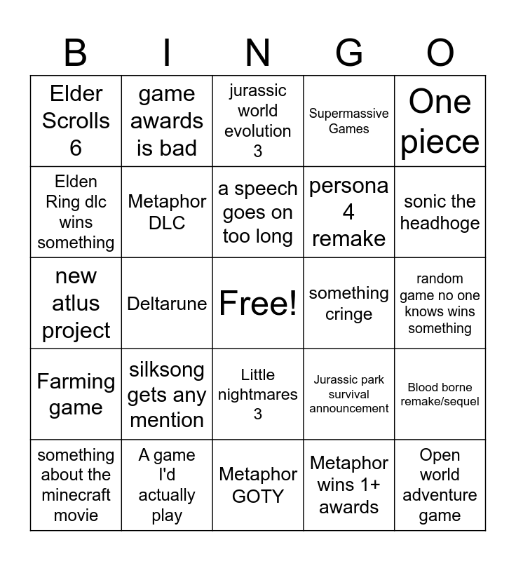 This bingo card has a free space and 24 words: silksong gets any mention, A game I'd actually play, a speech goes on too long, something about the minecraft movie, One piece, Elder Scrolls 6, Elden Ring dlc wins something, game awards is bad, something cringe, Little nightmares 3, persona 4 remake, new atlus project, Jurassic park survival announcement, Blood borne remake/sequel, Metaphor DLC, Metaphor wins 1+ awards, random game no one knows wins something, jurassic world evolution 3, sonic the headhoge, Deltarune, Open world adventure game, Farming game, Supermassive Games and Metaphor GOTY.