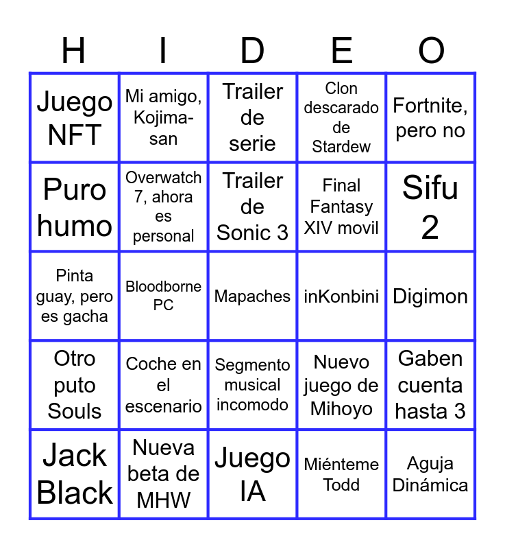 This bingo card has a free space and 24 words: Coche en el escenario, Nueva beta de MHW, Trailer de Sonic 3, Jack Black, Fortnite, pero no, Juego NFT, Puro humo, Mi amigo, Kojima-san, inKonbini, Segmento musical incomodo, Final Fantasy XIV movil, Pinta guay, pero es gacha, Nuevo juego de Mihoyo, Gaben cuenta hasta 3, Overwatch 7, ahora es personal, Miénteme Todd, Digimon, Trailer de serie, Sifu 2, Bloodborne PC, Aguja Dinámica, Otro puto Souls, Clon descarado de Stardew and Juego IA.