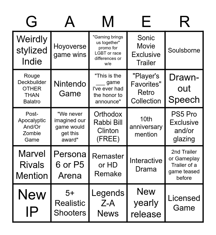 This bingo card has a free space and 24 words: Persona 6 or P5 Arena, 5+ Realistic Shooters, "This is the ___ game I've ever had the honor to announce", New IP, Soulsborne, Weirdly stylized Indie, Rouge Deckbuilder OTHER THAN Balatro, Hoyoverse game wins, 10th anniversary mention, Remaster or HD Remake, "Player's Favorites" Retro Collection, Post-Apocalyptic And/Or Zombie Game, Interactive Drama, 2nd Trailer or Gameplay Trailer of a game teased before, Nintendo Game, New yearly release, PS5 Pro Exclusive and/or glazing, "Gaming brings us together" promo for LGBT or race differences or w/e, Drawn-out Speech, "We never imagined our game would get this award", Licensed Game, Marvel Rivals Mention, Sonic Movie Exclusive Trailer and Legends Z-A News.