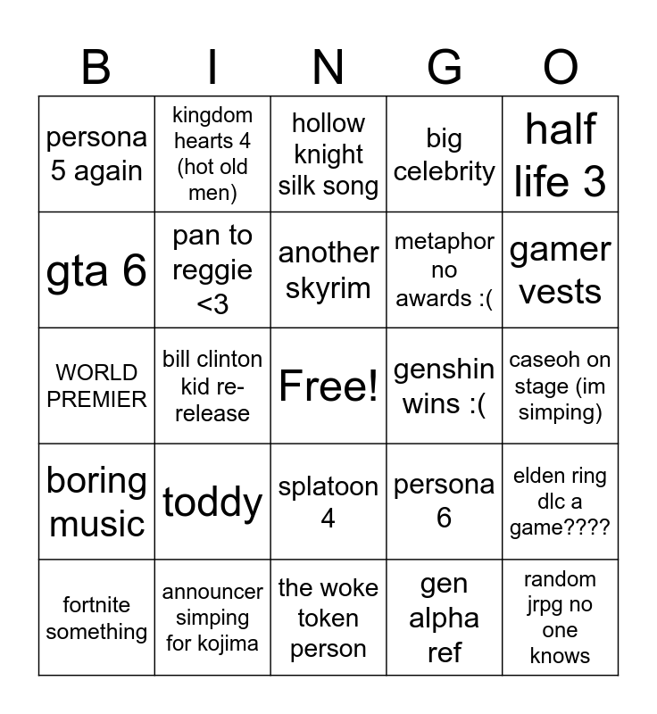 This bingo card has a free space and 24 words: toddy, announcer simping for kojima, another skyrim, fortnite something, half life 3, persona 5 again, gta 6, kingdom hearts 4 (hot old men), genshin wins :(, splatoon 4, metaphor no awards :(, WORLD PREMIER, persona 6, elden ring dlc a game????, pan to reggie <3, gen alpha ref, caseoh on stage (im simping), hollow knight silk song, gamer vests, bill clinton kid re-release, random jrpg no one knows, boring music, big celebrity and the woke token person.