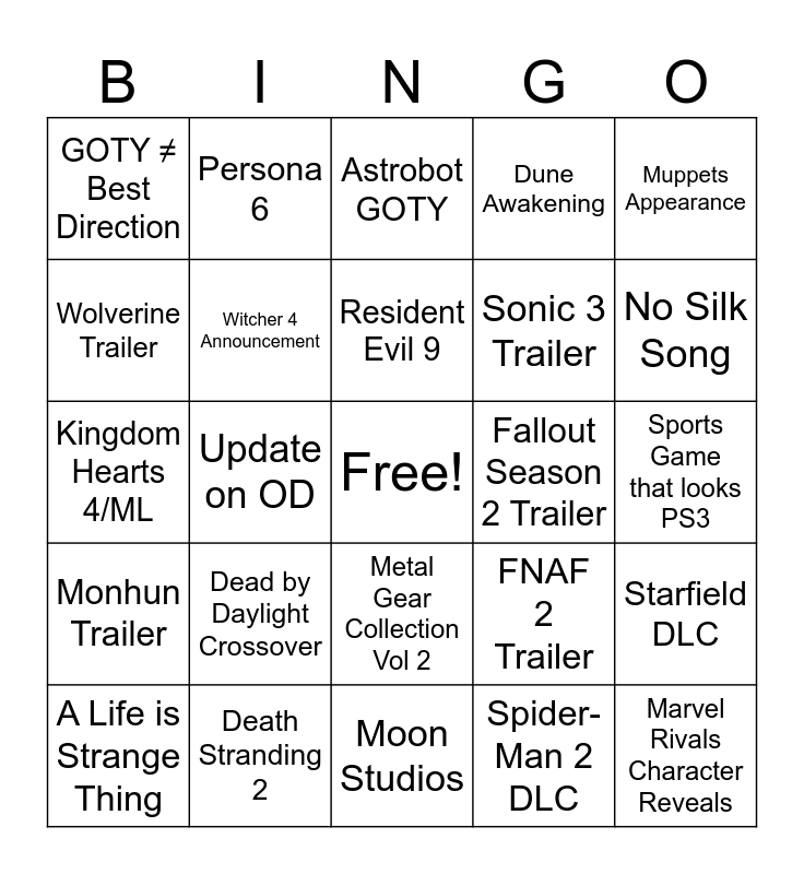 This bingo card has a free space and 24 words: Dead by Daylight Crossover, Death Stranding 2, Resident Evil 9, A Life is Strange Thing, Muppets Appearance, GOTY ≠ Best Direction, Wolverine Trailer, Persona 6, Fallout Season 2 Trailer, Metal Gear Collection Vol 2, Sonic 3 Trailer, Kingdom Hearts 4/ML, FNAF 2 Trailer, Starfield DLC, Witcher 4 Announcement, Spider-Man 2 DLC, Sports Game that looks PS3, Astrobot GOTY, No Silk Song, Update on OD, Marvel Rivals Character Reveals, Monhun Trailer, Dune Awakening and Moon Studios.