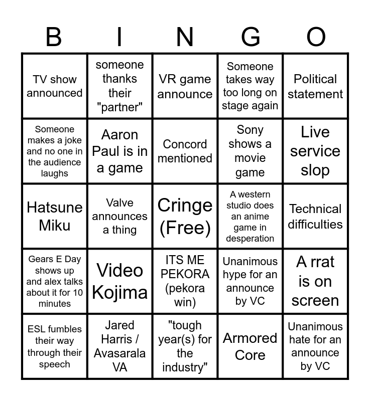 This bingo card has a free space and 39 words: Elden Ring DLC Wins GOTY, Josef Fares takes the mic, Troon shows up, Aaron Paul is in a game, ESL fumbles their way through their speech, ITS ME PEKORA (pekora win), Concord mentioned, GTA 6, Political statement, Gears E Day shows up and alex talks about it for 10 minutes, Valve announces a thing, Someone takes way too long on stage again, Unanimous hate for an announce by VC, Technical difficulties, A western studio does an anime game in desperation, Video Kojima, A dormant franchise (10+ years) comes back, TV show announced, A mascot for an ad is on stage again, Unanimous hype for an announce by VC, Someone makes a joke and no one in the audience laughs, "tough year(s) for the industry", Sony shows a movie game, Live service slop, remaster no one wants, joke about long speeches, someone uses a translator, Fromsoft announce, n-word, someone thanks their "partner", capeshit game, e-girl shows up, VR game announce, Jared Harris / Avasarala VA, Armored Core, Game announce for a non-game IP, A rrat is on screen, Hatsune Miku and dead studio mentioned.