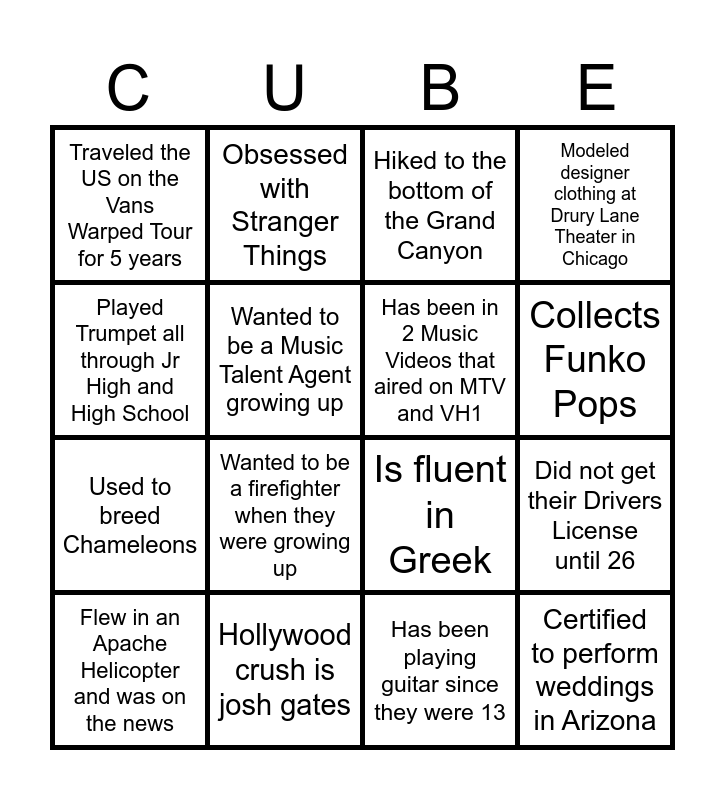 This bingo card has 16 words: Hollywood crush is josh gates, Did not get their Drivers License until 26, Hiked to the bottom of the Grand Canyon, Traveled the US on the Vans Warped Tour for 5 years, Used to breed Chameleons, Obsessed with Stranger Things, Is fluent in Greek, Has been playing guitar since they were 13, Played Trumpet all through Jr High and High School, Wanted to be a Music Talent Agent growing up, Flew in an Apache Helicopter and was on the news, Modeled designer clothing at Drury Lane Theater in Chicago, Wanted to be a firefighter when they were growing up, Collects Funko Pops, Has been in 2 Music Videos that aired on MTV and VH1 and Certified to perform weddings in Arizona.