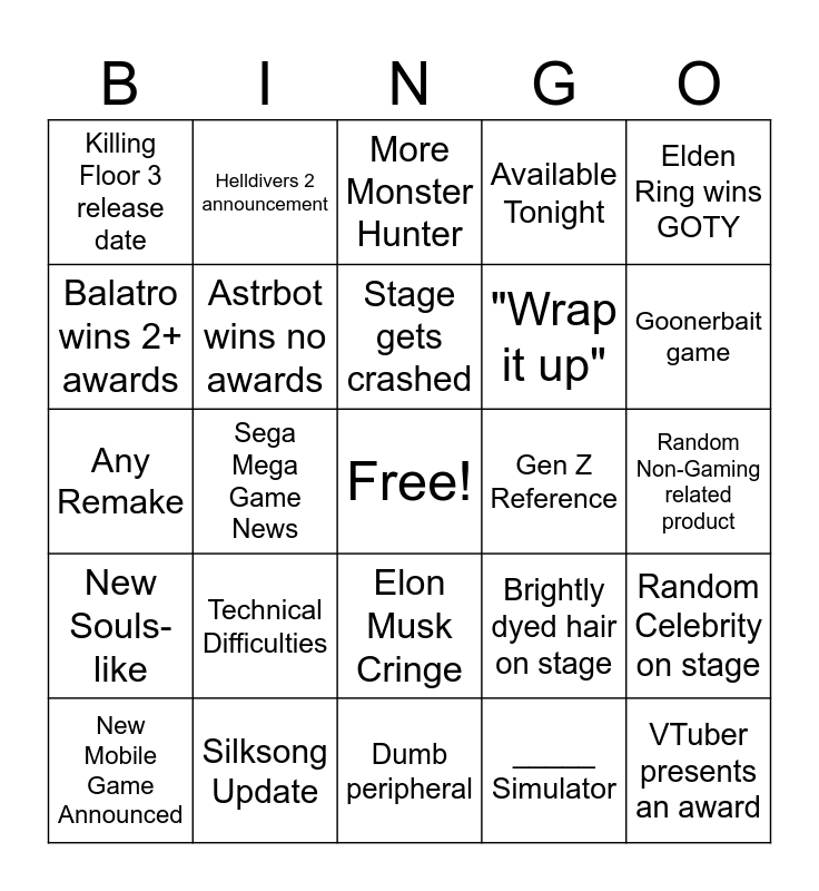 This bingo card has a free space and 24 words: Technical Difficulties, Silksong Update, Stage gets crashed, New Mobile Game Announced, Elden Ring wins GOTY, Killing Floor 3 release date, Balatro wins 2+ awards, Helldivers 2 announcement, Gen Z Reference, Elon Musk Cringe, "Wrap it up", Any Remake, Brightly dyed hair on stage, Random Celebrity on stage, Astrbot wins no awards, _____ Simulator, Random Non-Gaming related product, More Monster Hunter, Goonerbait game, Sega Mega Game News, VTuber presents an award, New Souls-like, Available Tonight and Dumb peripheral.