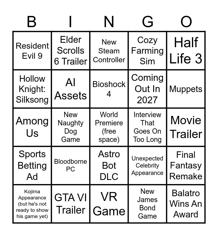 This bingo card has a free space and 24 words: Bloodborne PC, GTA VI Trailer, Bioshock 4, Kojima Appearance (but he's not ready to show his game yet), Half Life 3, Resident Evil 9, Hollow Knight: Silksong, Elder Scrolls 6 Trailer, Interview That Goes On Too Long, Astro Bot DLC, Coming Out In 2027, Among Us, Unexpected Celebrity Appearance, Final Fantasy Remake, AI Assets, New James Bond Game, Movie Trailer, New Steam Controller, Muppets, New Naughty Dog Game, Balatro Wins An Award, Sports Betting Ad, Cozy Farming Sim and VR Game.