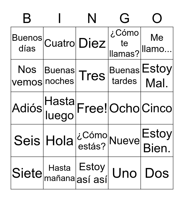 This bingo card has a free space and 24 words: Hola, Hasta mañana, Tres, Siete, Me llamo..., Buenos días, Nos vemos, Cuatro, Ocho, ¿Cómo estás?, Buenas tardes, Adiós, Nueve, Estoy Bien., Buenas noches, Uno, Cinco, Diez, Estoy Mal., Hasta luego, Dos, Seis, ¿Cómo te llamas? and Estoy así así.