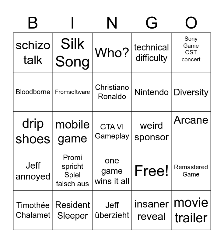 This bingo card has 25 words: Promi spricht Spiel falsch aus, Jeff überzieht, Christiano Ronaldo, Timothée Chalamet, Sony Game OST concert, schizo talk, Bloodborne, Silk Song, weird sponsor, one game wins it all, Nintendo, drip shoes, Free!, Remastered Game, Fromsoftware, movie trailer, Arcane, Who?, Diversity, mobile game, GTA VI Gameplay, Resident Sleeper, Jeff annoyed, technical difficulty and insaner reveal.