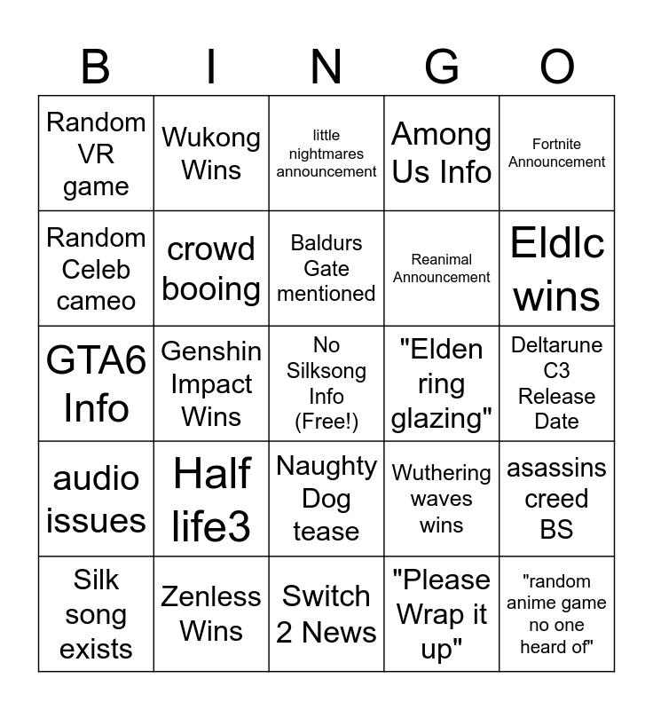 This bingo card has a free space and 24 words: Half life3, Zenless Wins, Baldurs Gate mentioned, Silk song exists, Fortnite Announcement, Random VR game, Random Celeb cameo, Wukong Wins, "Elden ring glazing", Naughty Dog tease, Reanimal Announcement, GTA6 Info, Wuthering waves wins, asassins creed BS, crowd booing, "Please Wrap it up", Deltarune C3 Release Date, little nightmares announcement, Eldlc wins, Genshin Impact Wins, "random anime game no one heard of", audio issues, Among Us Info and Switch 2 News.