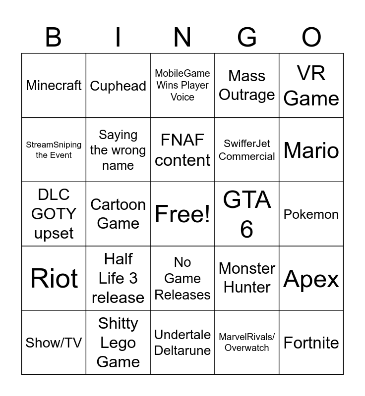 This bingo card has a free space and 24 words: Half Life 3 release, Shitty Lego Game, FNAF content, Show/TV, VR Game, Minecraft, StreamSniping the Event, Cuphead, GTA 6, No Game Releases, SwifferJet Commercial, DLC GOTY upset, Monster Hunter, Apex, Saying the wrong name, MarvelRivals/ Overwatch, Pokemon, MobileGame Wins Player Voice, Mario, Cartoon Game, Fortnite, Riot, Mass Outrage and Undertale Deltarune.