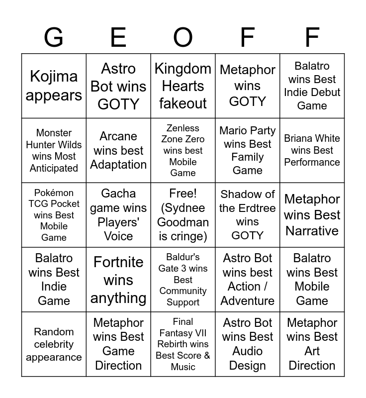 This bingo card has a free space and 29 words: Random celebrity appearance, Geoff mispronounces something, Gacha game wins Players' Voice, Farming sim jumpscare, Kojima appears, Kingdom Hearts fakeout, Arcane wins best Adaptation, Fortnite wins anything, Shadow of the Erdtree wins GOTY, Metaphor wins Best Game Direction, Metaphor wins Best Narrative, Metaphor wins Best Art Direction, Final Fantasy VII Rebirth wins Best Score & Music, Astro Bot wins Best Audio Design, Briana White wins Best Performance, FFXIV: Dawntrail wins Best Ongoing, Baldur's Gate 3 wins Best Community Support, Balatro wins Best Indie Game, Balatro wins Best Indie Debut Game, Pokémon TCG Pocket wins Best Mobile Game, Astro Bot wins best Action / Adventure, Metaphor wins Best RPG, Mario Party wins Best Family Game, Monster Hunter Wilds wins Most Anticipated, Metaphor wins GOTY, Astro Bot wins GOTY, Balatro wins Best Mobile Game, Zenless Zone Zero wins best Mobile Game and FF7 Rebirth wins Best Narrative.