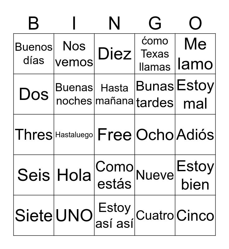 This bingo card has a free space and 24 words: Hola, UNO, Hasta mañana, Siete, Me lamo, Buenos días, Dos, Nos vemos, Ocho, Como estás, Bunas tardes, Thres, Nueve, Estoy bien, Buenas noches, Cuatro, Adiós, Diez, Estoy mal, Hastaluego, Cinco, Seis, ćomo Texas llamas and Estoy así así.