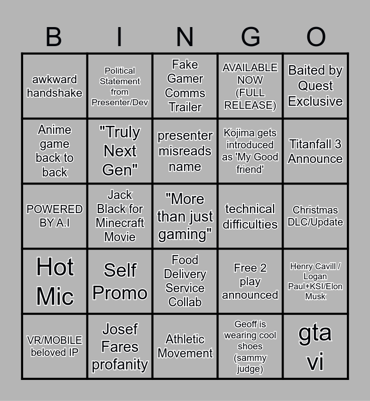 This bingo card has 25 words: Self Promo, Athletic Movement, presenter misreads name, VR/MOBILE beloved IP, Baited by Quest Exclusive, awkward handshake, Anime game back to back, Political Statement from Presenter/Dev, technical difficulties, Food Delivery Service Collab, Kojima gets introduced as 'My Good friend', POWERED BY A.I, Free 2 play announced, Henry Cavill / Logan Paul+KSI/Elon Musk, "Truly Next Gen", gta vi, Christmas DLC/Update, Fake Gamer Comms Trailer, Titanfall 3 Announce, Jack Black for Minecraft Movie, "More than just gaming", Josef Fares profanity, Hot Mic, AVAILABLE NOW (FULL RELEASE) and Geoff is wearing cool shoes (sammy judge).