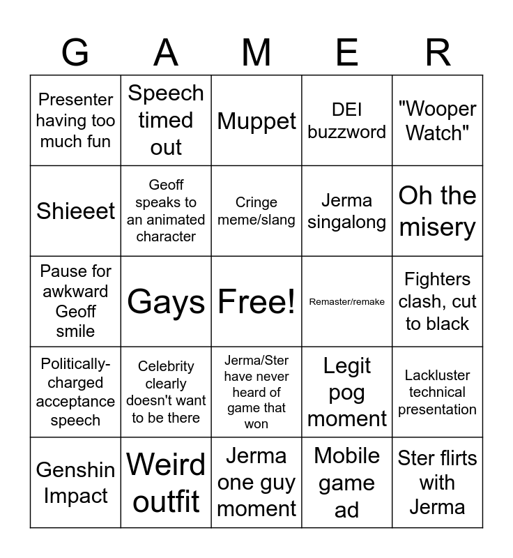 This bingo card has a free space and 24 words: Celebrity clearly doesn't want to be there, Weird outfit, Cringe meme/slang, Genshin Impact, "Wooper Watch", Presenter having too much fun, Shieeet, Speech timed out, Remaster/remake, Jerma/Ster have never heard of game that won, Jerma singalong, Pause for awkward Geoff smile, Legit pog moment, Lackluster technical presentation, Geoff speaks to an animated character, Mobile game ad, Fighters clash, cut to black, Muppet, Oh the misery, Gays, Ster flirts with Jerma, Politically-charged acceptance speech, DEI buzzword and Jerma one guy moment.