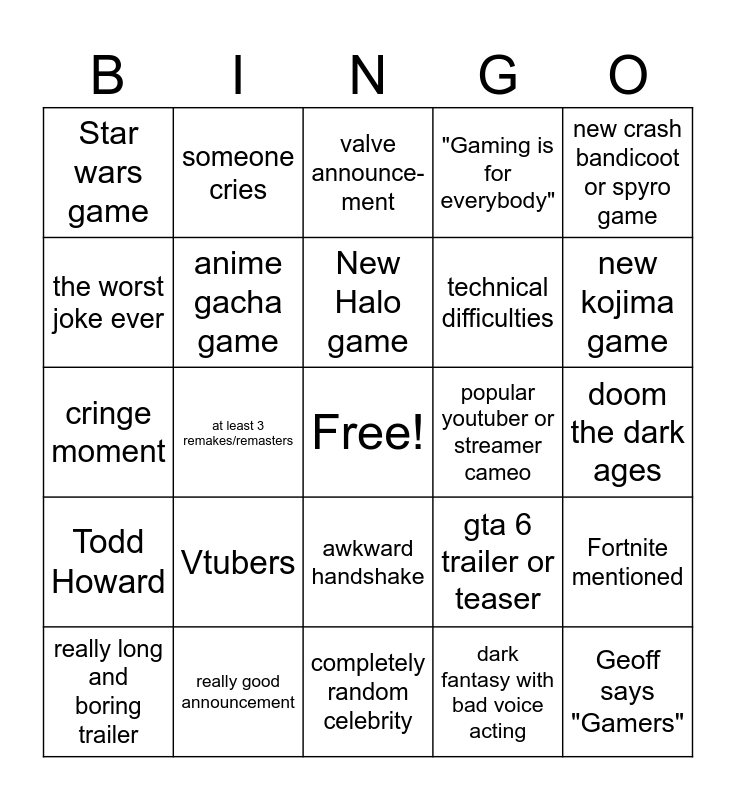 This bingo card has a free space and 24 words: Vtubers, really good announcement, New Halo game, really long and boring trailer, new crash bandicoot or spyro game, Star wars game, the worst joke ever, someone cries, popular youtuber or streamer cameo, awkward handshake, technical difficulties, cringe moment, gta 6 trailer or teaser, Fortnite mentioned, anime gacha game, dark fantasy with bad voice acting, doom the dark ages, valve announce-ment, new kojima game, at least 3 remakes/remasters, Geoff says "Gamers", Todd Howard, "Gaming is for everybody" and completely random celebrity.