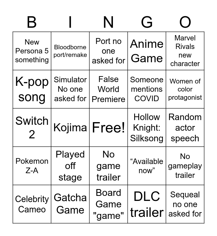 This bingo card has a free space and 42 words: Dog in trailer, False World Premiere, New AAA IP, Played off stage, DLC trailer, No gameplay trailer, Sequeal no one asked for, Remake no one asked for, Port no one asked for, No game trailer, Random actor speech, Women of color protagonist, Kojima, Marvel Rivals new character, Trailer for already out game, “Available now”, Nintendo trailer, Switch 2, GTA 6, Bloodborne port/remake, K-pop song, New Silent Hill, New FromSoftware title, New Persona 5 something, Random musical number, Half-Life 3, Someone mentions COVID, Someone mentions industry hardship, “Realistic SIMS” trailer, Mobile Game Trailer, Farming Sim, Pokemon Z-A, Simulator No one asked for, Board Game "game", Dragon Game, Celebrity Cameo, Gatcha Game, Hollow Knight: Silksong, Reggie, New hero shooter, Anime Game and New Game TV Show.