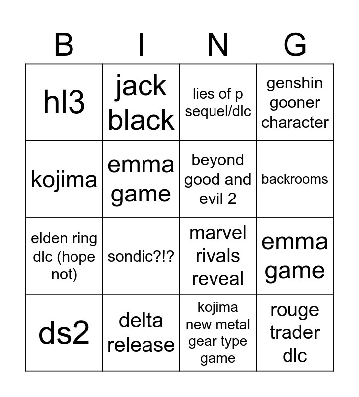 This bingo card has 16 words: delta release, emma game, lies of p sequel/dlc, hl3, elden ring dlc (hope not), jack black, marvel rivals reveal, kojima new metal gear type game, kojima, emma game, ds2, genshin gooner character, sondic?!?, backrooms, beyond good and evil 2 and rouge trader dlc.