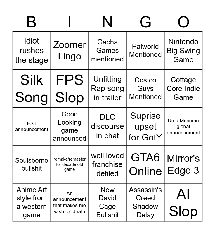 This bingo card has a free space and 24 words: remake/remaster for decade old game, An announcement that makes me wish for death, Unfitting Rap song in trailer, Anime Art style from a western game, Nintendo Big Swing Game, idiot rushes the stage, Silk Song, Zoomer Lingo, Suprise upset for GotY, well loved franchise defiled, Costco Guys Mentioned, ES6 announcement, GTA6 Online, Mirror's Edge 3, FPS Slop, Assassin's Creed Shadow Delay, Uma Musume global announcement, Gacha Games mentioned, Cottage Core Indie Game, Good Looking game announced, AI Slop, Soulsborne bullshit, Palworld Mentioned and New David Cage Bullshit.