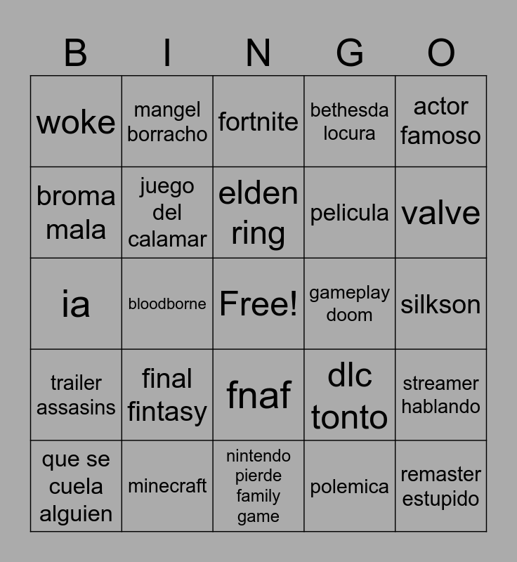 This bingo card has a free space and 24 words: final fintasy, minecraft, elden ring, que se cuela alguien, actor famoso, woke, broma mala, mangel borracho, gameplay doom, fnaf, pelicula, ia, dlc tonto, streamer hablando, juego del calamar, polemica, silkson, fortnite, valve, bloodborne, remaster estupido, trailer assasins, bethesda locura and nintendo pierde family game.
