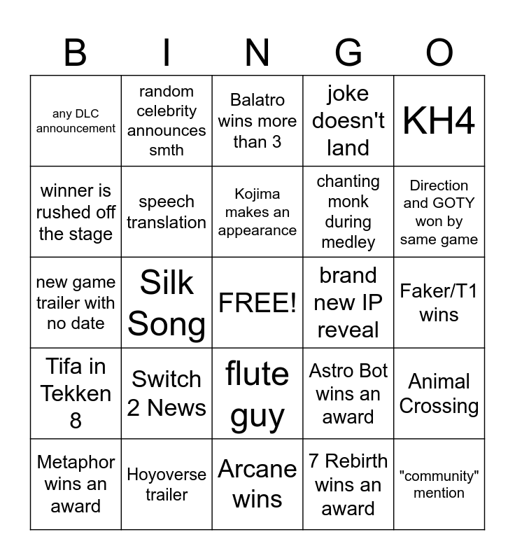 This bingo card has a free space and 24 words: Switch 2 News, Hoyoverse trailer, Kojima makes an appearance, Metaphor wins an award, KH4, any DLC announcement, winner is rushed off the stage, random celebrity announces smth, brand new IP reveal, flute guy, chanting monk during medley, new game trailer with no date, Astro Bot wins an award, Animal Crossing, speech translation, 7 Rebirth wins an award, Faker/T1 wins, Balatro wins more than 3, Direction and GOTY won by same game, Silk Song, "community" mention, Tifa in Tekken 8, joke doesn't land and Arcane wins.