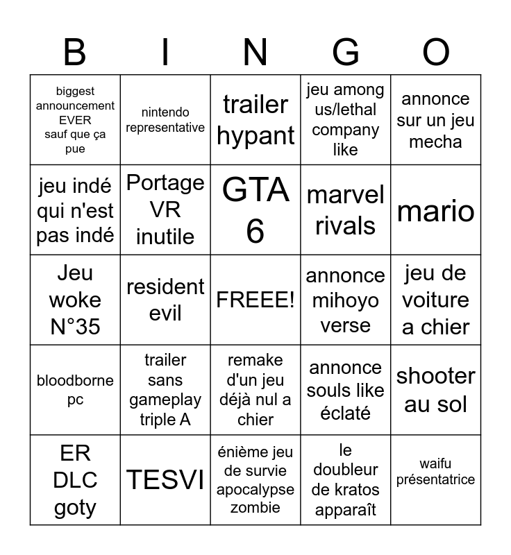 This bingo card has a free space and 24 words: ER DLC goty, trailer sans gameplay triple A, GTA 6, le doubleur de kratos apparaît, annonce sur un jeu mecha, biggest announcement EVER sauf que ça pue, nintendo representative, trailer hypant, annonce mihoyo verse, jeu de voiture a chier, Jeu woke N°35, Portage VR inutile, annonce souls like éclaté, shooter au sol, jeu indé qui n'est pas indé, TESVI, énième jeu de survie apocalypse zombie, jeu among us/lethal company like, mario, bloodborne pc, resident evil, remake d'un jeu déjà nul a chier, marvel rivals and waifu présentatrice.