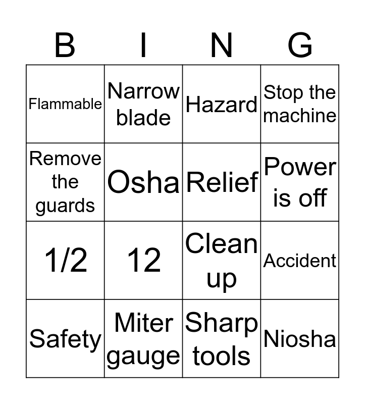 This bingo card has a free space and 15 words: Safety, Niosha, Hazard, Flammable, Power is off, Remove the guards, 12, Sharp tools, Osha, 1/2, Accident, Stop the machine, Relief, Narrow blade and Miter gauge.