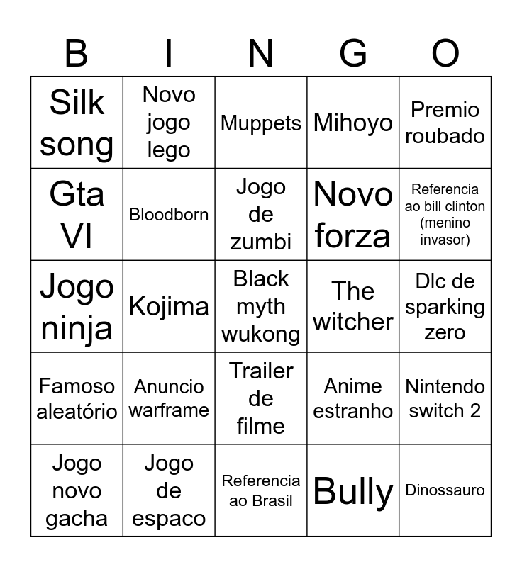 This bingo card has a free space and 24 words: Anuncio warframe, Jogo de espaco, Jogo de zumbi, Jogo novo gacha, Premio roubado, Silk song, Gta VI, Novo jogo lego, The witcher, Trailer de filme, Novo forza, Jogo ninja, Anime estranho, Nintendo switch 2, Bloodborn, Bully, Dlc de sparking zero, Muppets, Referencia ao bill clinton (menino invasor), Kojima, Dinossauro, Famoso aleatório, Mihoyo and Referencia ao Brasil.
