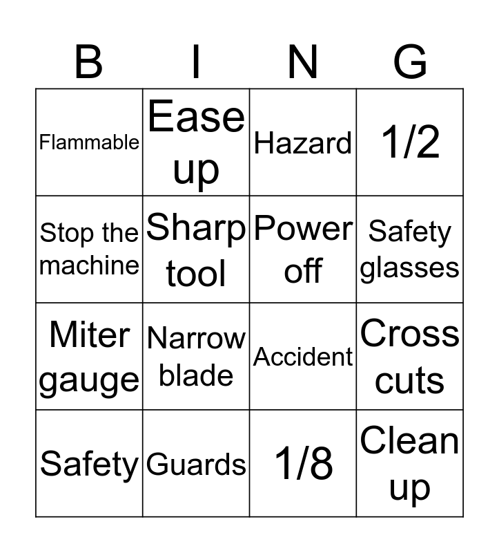 This bingo card has a free space and 15 words: Safety, Clean up, Hazard, Flammable, Safety glasses, Stop the machine, Narrow blade, 1/8, Sharp tool, Miter gauge, Cross cuts, 1/2, Power off, Ease up and Guards.