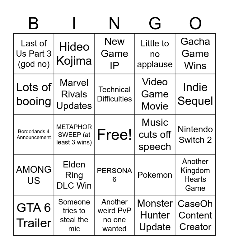 This bingo card has a free space and 24 words: Elden Ring DLC Win, Someone tries to steal the mic, Technical Difficulties, GTA 6 Trailer, Gacha Game Wins, Last of Us Part 3 (god no), Lots of booing, Hideo Kojima, Music cuts off speech, PERSONA 6, Video Game Movie, Borderlands 4 Announcement, Pokemon, Another Kingdom Hearts Game, Marvel Rivals Updates, Monster Hunter Update, Nintendo Switch 2, New Game IP, Indie Sequel, METAPHOR SWEEP (at least 3 wins), CaseOh Content Creator, AMONG US, Little to no applause and Another weird PvP no one wanted.