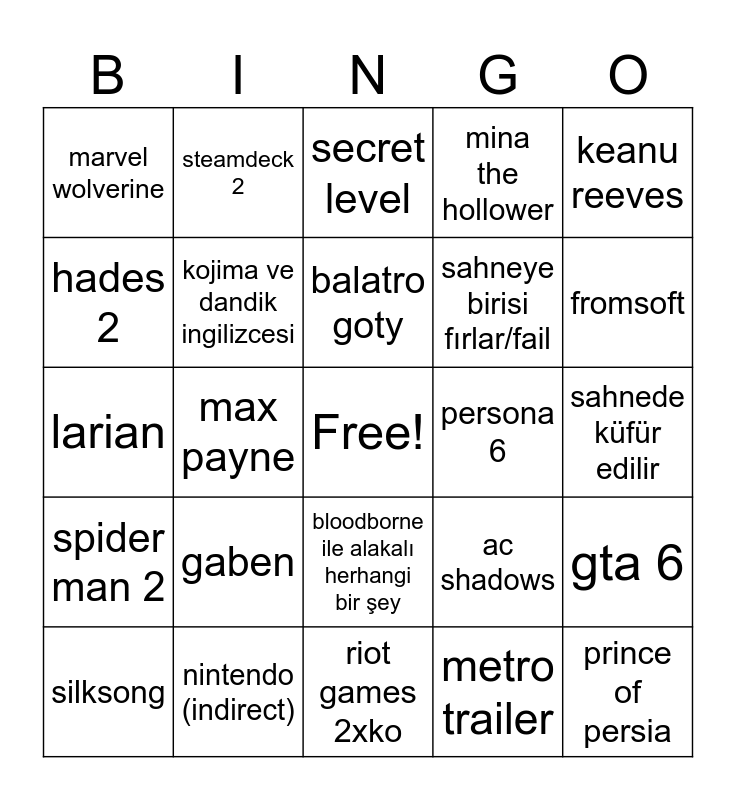 This bingo card has a free space and 24 words: gaben, nintendo (indirect), balatro goty, silksong, keanu reeves, marvel wolverine, hades 2, steamdeck 2, persona 6, bloodborne ile alakalı herhangi bir şey, sahneye birisi fırlar/fail, larian, ac shadows, gta 6, kojima ve dandik ingilizcesi, metro trailer, sahnede küfür edilir, secret level, fromsoft, max payne, prince of persia, spider man 2, mina the hollower and riot games 2xko.