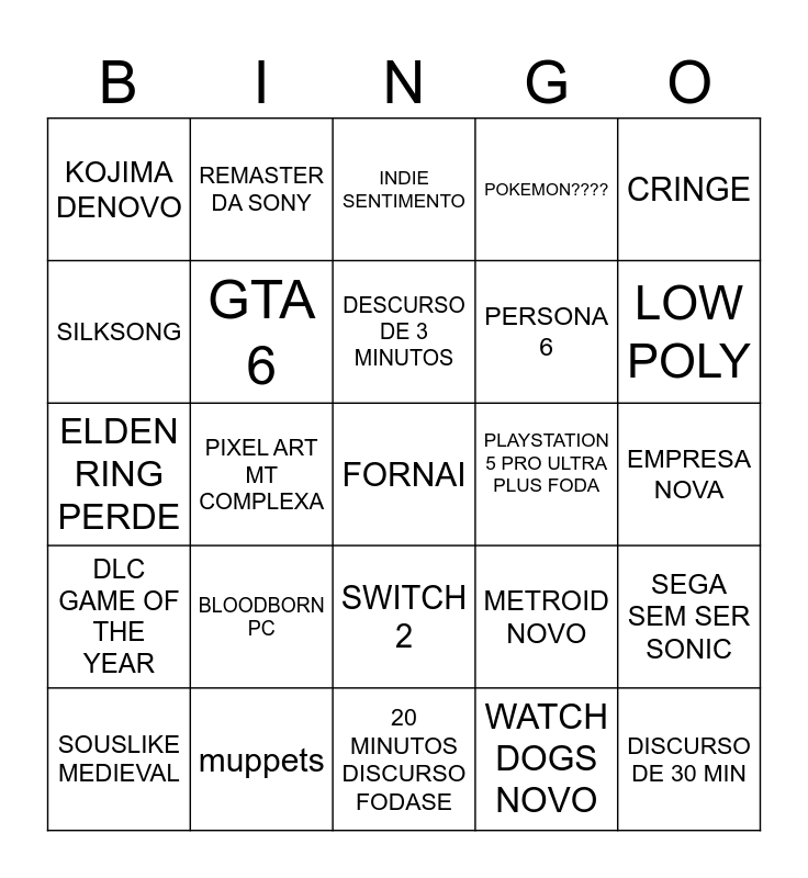 This bingo card has a free space and 24 words: BLOODBORN PC, muppets, DESCURSO DE 3 MINUTOS, SOUSLIKE MEDIEVAL, CRINGE, KOJIMA DENOVO, SILKSONG, REMASTER DA SONY, PLAYSTATION 5 PRO ULTRA PLUS FODA, SWITCH 2, PERSONA 6, ELDEN RING PERDE, METROID NOVO, SEGA SEM SER SONIC, GTA 6, WATCH DOGS NOVO, EMPRESA NOVA, INDIE SENTIMENTO, LOW POLY, PIXEL ART MT COMPLEXA, DISCURSO DE 30 MIN, DLC GAME OF THE YEAR, POKEMON???? and 20 MINUTOS DISCURSO FODASE.