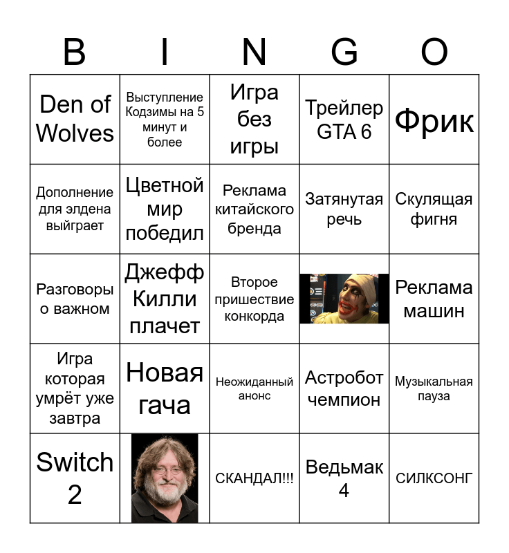 This bingo card has 2 images, a free space and 22 words: Новая гача, Реклама китайского бренда, Switch 2, Фрик, Den of Wolves, Дополнение для элдена выйграет, Выступление Кодзимы на 5 минут и более, Неожиданный анонс, Затянутая речь, Разговоры о важном, Астробот чемпион, Музыкальная пауза, Цветной мир победил, Ведьмак 4, Реклама машин, Игра без игры, Скулящая фигня, Джефф Килли плачет, СИЛКСОНГ, Игра которая умрёт уже завтра, Трейлер GTA 6 and СКАНДАЛ!!!.