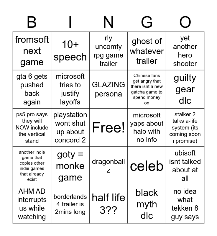 This bingo card has a free space and 24 words: goty = monke game, borderlands 4 trailer is 2mins long, GLAZING persona, AHM AD interrupts us while watching, yet another hero shooter, fromsoft next game, gta 6 gets pushed back again, 10+ speech, microsoft yaps about halo with no info, dragonball z, Chinese fans get angry that there isnt a new gatcha game to spend money on, ps5 pro says they will NOW include the vertical stand, celeb, ubisoft isnt talked about at all, microsoft tries to justify layoffs, black myth dlc, stalker 2 talks a-life system (its coming soon i promise), rly uncomfy rpg game trailer, guilty gear dlc, playstation wont shut up about concord 2, no idea what tekken 8 guy says, another indie game that copies other indie games that already exist, ghost of whatever trailer and half life 3??.