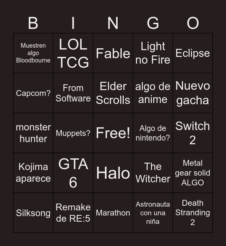 This bingo card has a free space and 24 words: Silksong, GTA 6, Elder Scrolls, Astronauta con una niña, Eclipse, Muestren algo Bloodbourne, LOL TCG, Fable, Algo de nintendo?, Switch 2, monster hunter, From Software, The Witcher, Metal gear solid ALGO, Capcom?, Remake de RE:5, Marathon, Light no Fire, Nuevo gacha, Kojima aparece, Muppets?, Halo, algo de anime and Death Stranding 2.