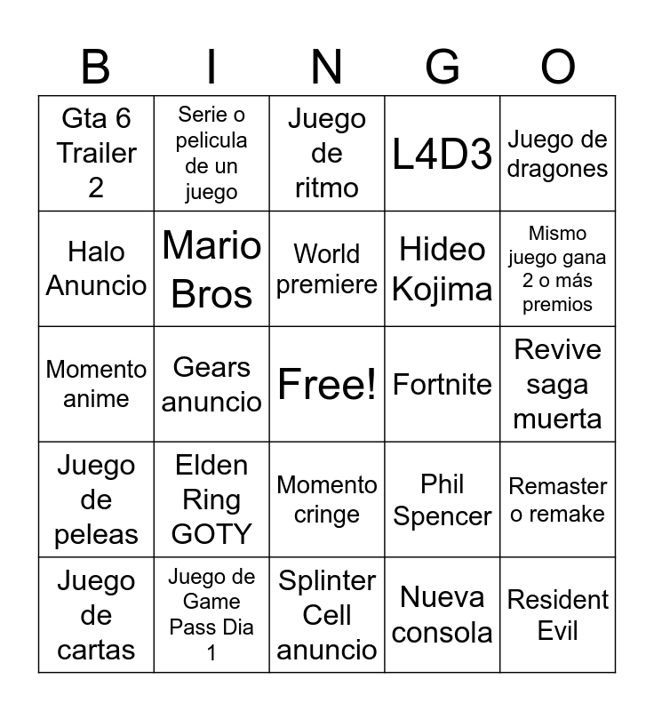 This bingo card has a free space and 24 words: Elden Ring GOTY, Juego de Game Pass Dia 1, World premiere, Juego de cartas, Juego de dragones, Gta 6 Trailer 2, Halo Anuncio, Serie o pelicula de un juego, Fortnite, Momento cringe, Hideo Kojima, Momento anime, Phil Spencer, Remaster o remake, Mario Bros, Nueva consola, Revive saga muerta, Juego de ritmo, Mismo juego gana 2 o más premios, Gears anuncio, Resident Evil, Juego de peleas, L4D3 and Splinter Cell anuncio.