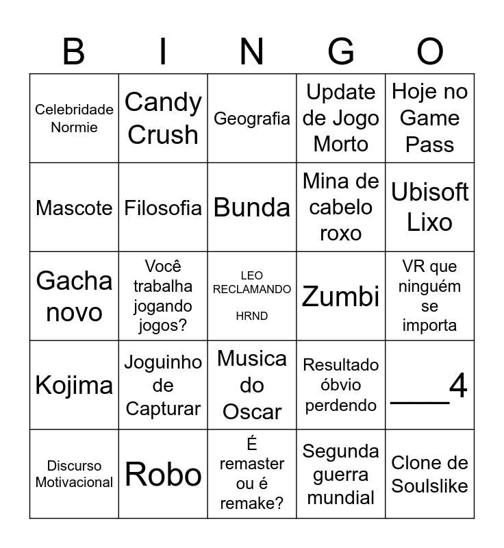 This bingo card has a free space and 24 words: Joguinho de Capturar, Robo, Bunda, Discurso Motivacional, Hoje no Game Pass, Celebridade Normie, Mascote, Candy Crush, Zumbi, Musica do Oscar, Mina de cabelo roxo, Gacha novo, Resultado óbvio perdendo, ___4, Filosofia, Segunda guerra mundial, VR que ninguém se importa, Geografia, Ubisoft Lixo, Você trabalha jogando jogos?, Clone de Soulslike, Kojima, Update de Jogo Morto and É remaster ou é remake?.
