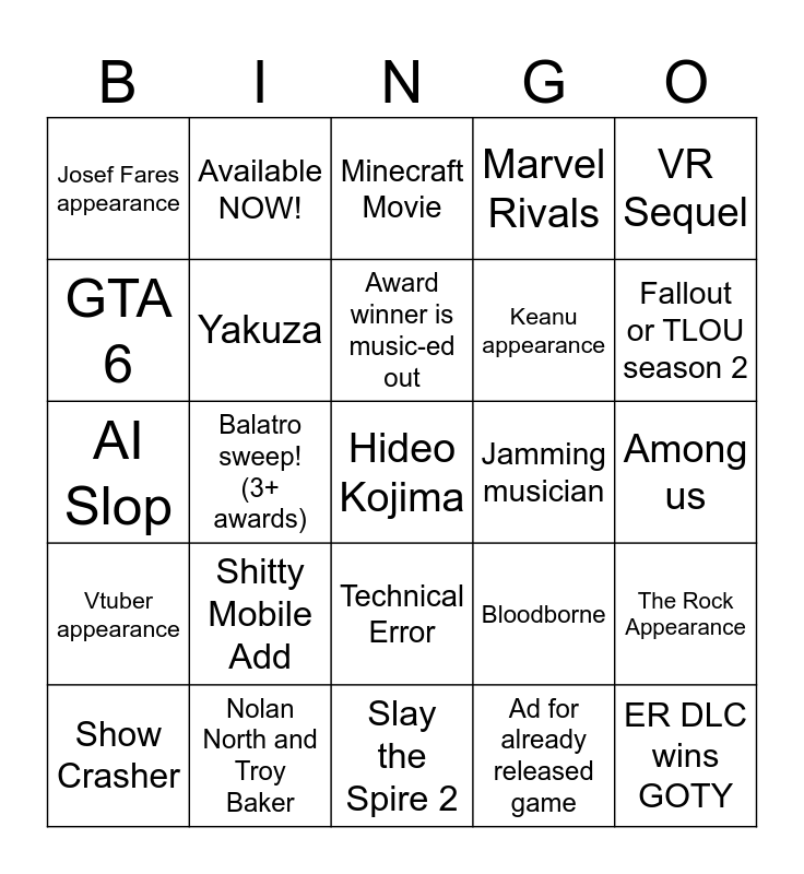 This bingo card has a free space and 24 words: Shitty Mobile Add, Nolan North and Troy Baker, Award winner is music-ed out, Show Crasher, VR Sequel, Josef Fares appearance, GTA 6, Available NOW!, Jamming musician, Technical Error, Keanu appearance, AI Slop, Bloodborne, The Rock Appearance, Yakuza, Ad for already released game, Among us, Minecraft Movie, Fallout or TLOU season 2, Balatro sweep! (3+ awards), ER DLC wins GOTY, Vtuber appearance, Marvel Rivals and Slay the Spire 2.