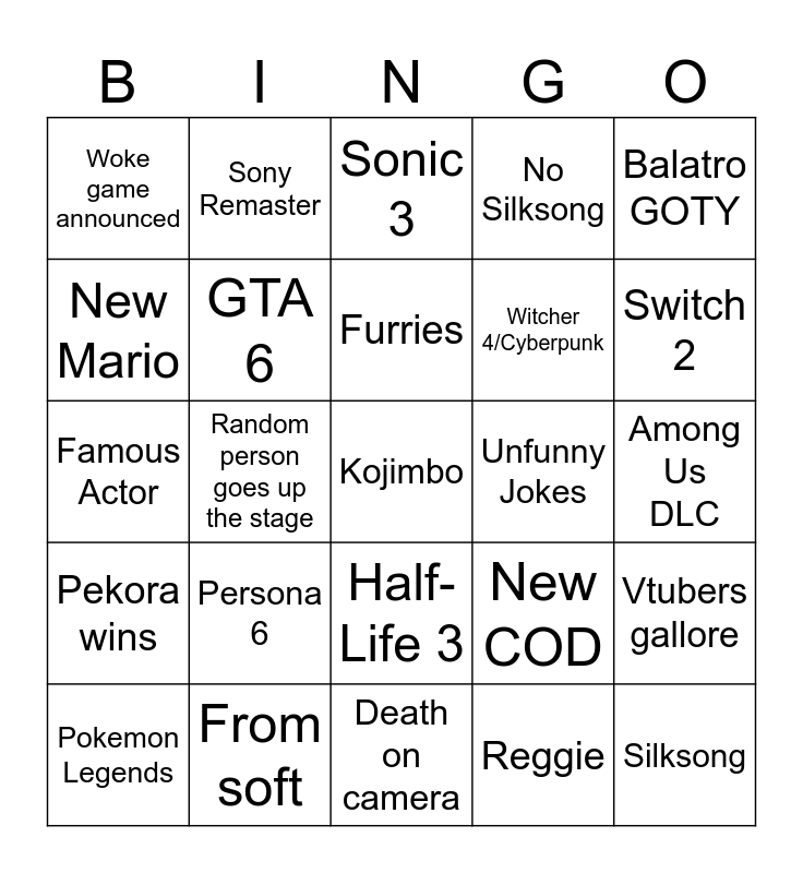 This bingo card has a free space and 24 words: Persona 6, From soft, Furries, Pokemon Legends, Balatro GOTY, Woke game announced, New Mario, Sony Remaster, Unfunny Jokes, Half-Life 3, Witcher 4/Cyberpunk, Famous Actor, New COD, Vtubers gallore, GTA 6, Reggie, Among Us DLC, Sonic 3, Switch 2, Random person goes up the stage, Silksong, Pekora wins, No Silksong and Death on camera.