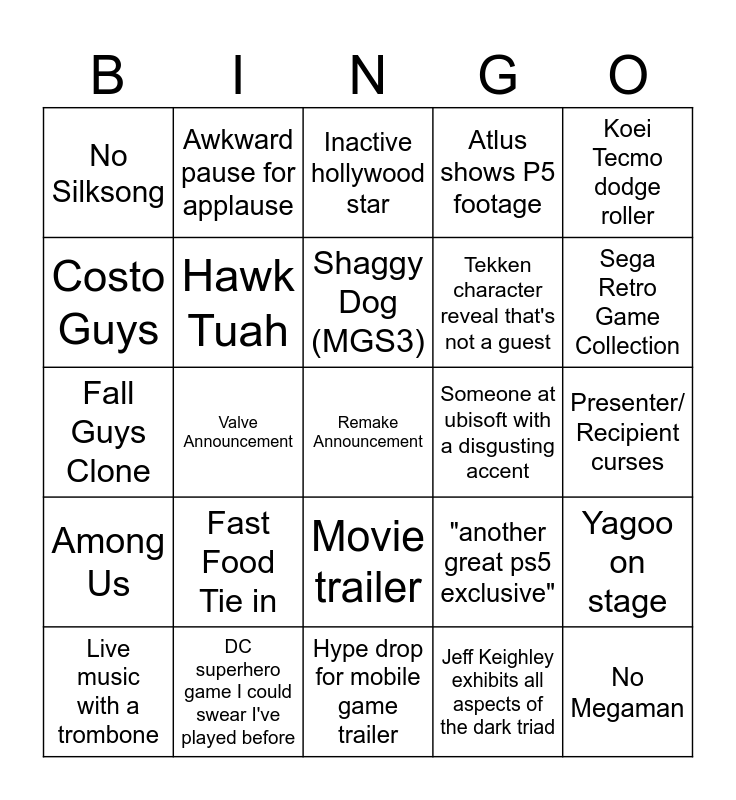 This bingo card has a free space and 24 words: Fast Food Tie in, DC superhero game I could swear I've played before, Shaggy Dog (MGS3), Live music with a trombone, Koei Tecmo dodge roller, No Silksong, Costo Guys, Awkward pause for applause, Someone at ubisoft with a disgusting accent, Movie trailer, Tekken character reveal that's not a guest, Fall Guys Clone, "another great ps5 exclusive", Yagoo on stage, Hawk Tuah, Jeff Keighley exhibits all aspects of the dark triad, Presenter/ Recipient curses, Inactive hollywood star, Sega Retro Game Collection, Valve Announcement, No Megaman, Among Us, Atlus shows P5 footage and Hype drop for mobile game trailer.