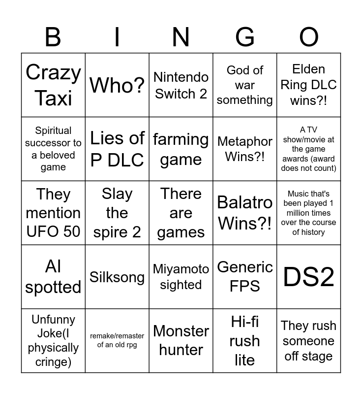 This bingo card has a free space and 24 words: Silksong, remake/remaster of an old rpg, farming game, Unfunny Joke(I physically cringe), Elden Ring DLC wins?!, Crazy Taxi, Spiritual successor to a beloved game, Who?, Balatro Wins?!, Miyamoto sighted, Metaphor Wins?!, They mention UFO 50, Generic FPS, DS2, Lies of P DLC, Hi-fi rush lite, Music that's been played 1 million times over the course of history, Nintendo Switch 2, A TV show/movie at the game awards (award does not count), Slay the spire 2, They rush someone off stage, AI spotted, God of war something and Monster hunter.