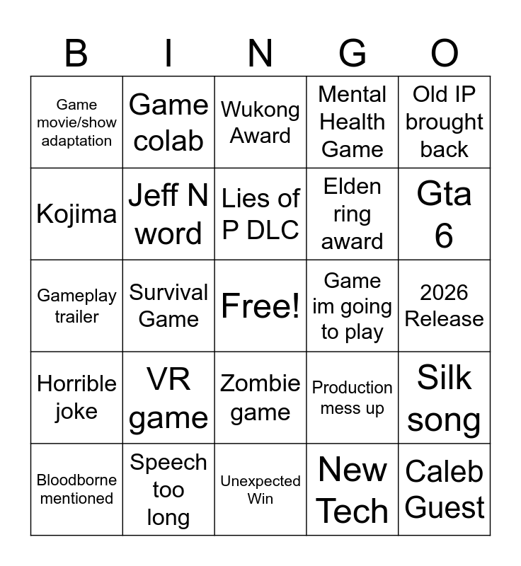 This bingo card has a free space and 24 words: VR game, Speech too long, Lies of P DLC, Bloodborne mentioned, Old IP brought back, Game movie/show adaptation, Kojima, Game colab, Game im going to play, Zombie game, Elden ring award, Gameplay trailer, Production mess up, Silk song, Jeff N word, New Tech, 2026 Release, Wukong Award, Gta 6, Survival Game, Caleb Guest, Horrible joke, Mental Health Game and Unexpected Win.