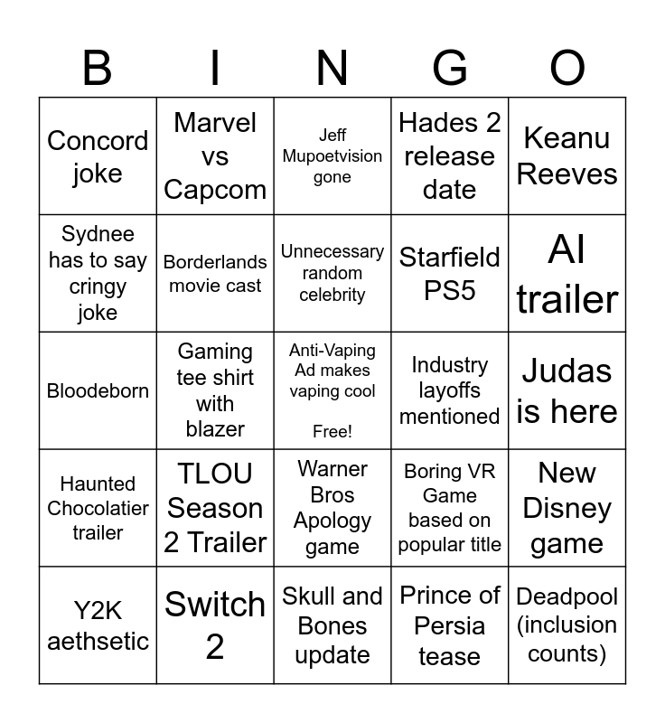 This bingo card has a free space and 24 words: TLOU Season 2 Trailer, Switch 2, Unnecessary random celebrity, Y2K aethsetic, Keanu Reeves, Concord joke, Sydnee has to say cringy joke, Marvel vs Capcom, Industry layoffs mentioned, Warner Bros Apology game, Starfield PS5, Bloodeborn, Boring VR Game based on popular title, New Disney game, Borderlands movie cast, Prince of Persia tease, Judas is here, Jeff Mupoetvision gone, AI trailer, Gaming tee shirt with blazer, Deadpool (inclusion counts), Haunted Chocolatier trailer, Hades 2 release date and Skull and Bones update.
