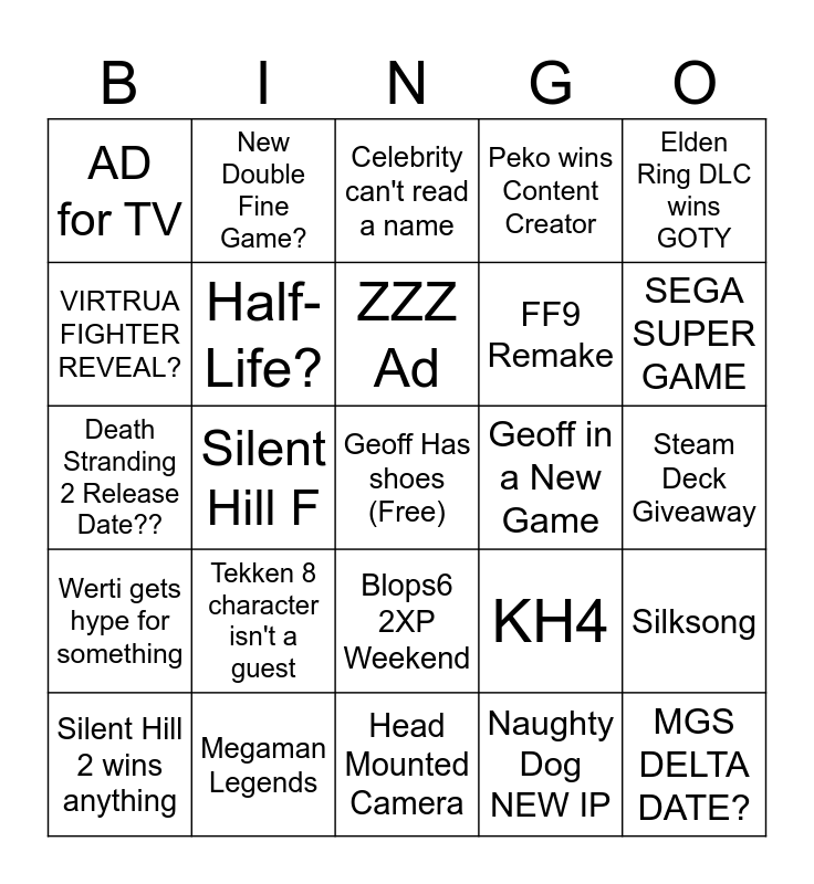This bingo card has a free space and 24 words: Tekken 8 character isn't a guest, Megaman Legends, ZZZ Ad, Silent Hill 2 wins anything, Elden Ring DLC wins GOTY, AD for TV, VIRTRUA FIGHTER REVEAL?, New Double Fine Game?, Geoff in a New Game, Blops6 2XP Weekend, FF9 Remake, Death Stranding 2 Release Date??, KH4, Silksong, Half-Life?, Naughty Dog NEW IP, Steam Deck Giveaway, Celebrity can't read a name, SEGA SUPER GAME, Silent Hill F, MGS DELTA DATE?, Werti gets hype for something, Peko wins Content Creator and Head Mounted Camera.